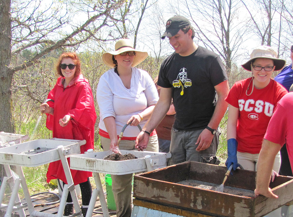 Students conduct an excavation at the Little Elk Unit of the Charles A. Lindbergh State Park. The area was the site of a 19th century mission, and during their spring dig students were looking for evidence of a structure and of diet and dress at the mission.