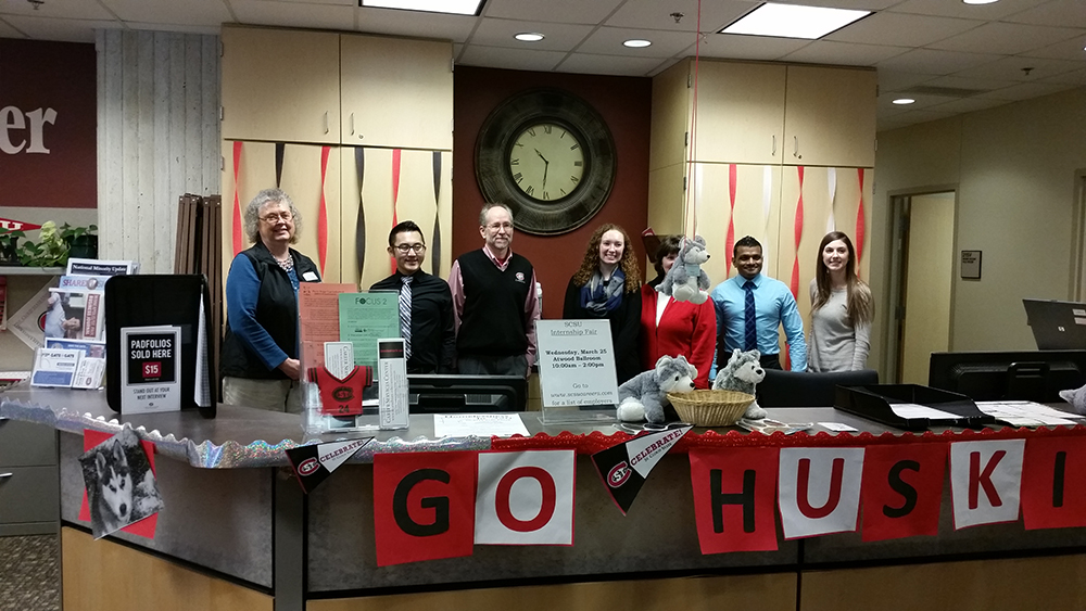 Participants in the Celebrate! Huskies Spirit Challenge office decorating contest show their Huskies pride during winter Celebrate! St. Cloud State 2015. Fifteen on campus entities and nine local businesses participated in the contest.