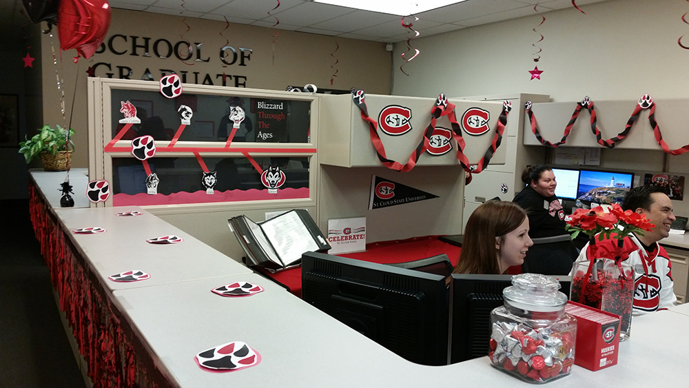 Participants in the Celebrate! Huskies Spirit Challenge office decorating contest show their Huskies pride during winter Celebrate! St. Cloud State 2015. Fifteen on campus entities and nine local businesses participated in the contest.