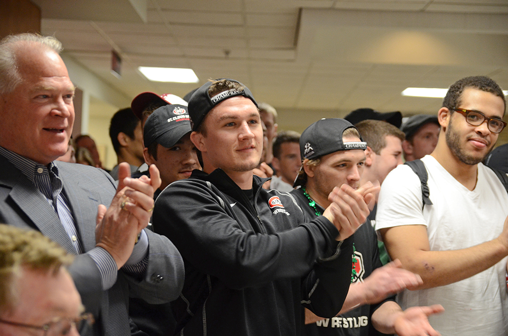 HomeUniversity newsAthletics newsPhoto gallery: Huskies honor national champion wrestlers Athletics newsPhoto galleriesWrestling 2015 NCAA Champions Photo gallery: Huskies honor national champion wrestlers By Anna Kurth March 17, 2015 Share FacebookTwitterPinterestWhatsApp St. Cloud State students, alumni, faculty, staff and friends honor the 2015 NCAA Division II National Championship wrestling team in a celebration March 17 in the Atwood Memorial Center. DSC_9569 Image 8 of 13 Wrestlers applaud Coach Steve Costanzo's speech. TagsHuskies Wrestling 2015 National Champions Share FacebookTwitterPinterestWhatsApp Anna Kurth Latest Stories Two SCSU employees receive inaugural Staff Excellence Awards April 24, 2026 SCSU announces Distinguished Thesis Award winner April 22, 2026 SCSU Athletics Adds Men’s and Women’s Golf, Men’s Cross Country April 16, 2026 Undefeated SCSU League of Legends team headed to national tournament April 16, 2026 Load more Huskies in the News Larson, Motzko give blessing to St. Cloud State’s hire of Nick Oliver April 17, 2026 Huskies Giving Week at SCSU starts Thursday April 17, 2026 SCSU to host free Planetarium Concert featuring immersive music April 17, 2026 By planning to raze old buildings, Minnesota college leaders see new reality April 17, 2026 Load more