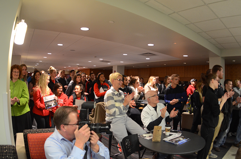 A crowd of proud wrestling fans fill the Atwood Memorial Center lounge for the celebration.