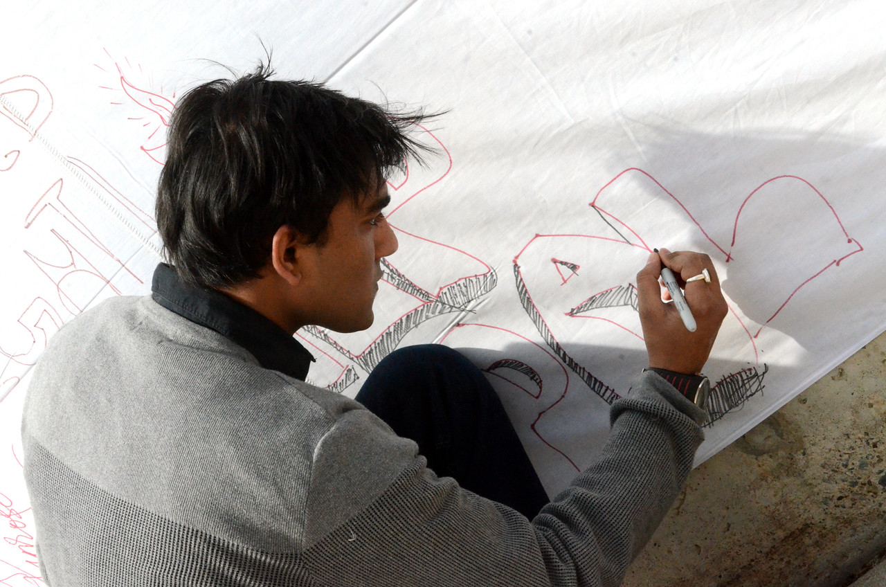 Akshya Singh leaves a message of hope on a banner during the Concert for Nepal. Photo by Jeff Wood '81 '87 '95