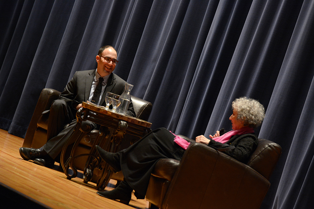 Margaret Atwood sits down with English department Chair Glenn Davis during her talk for the Common Reading Program.