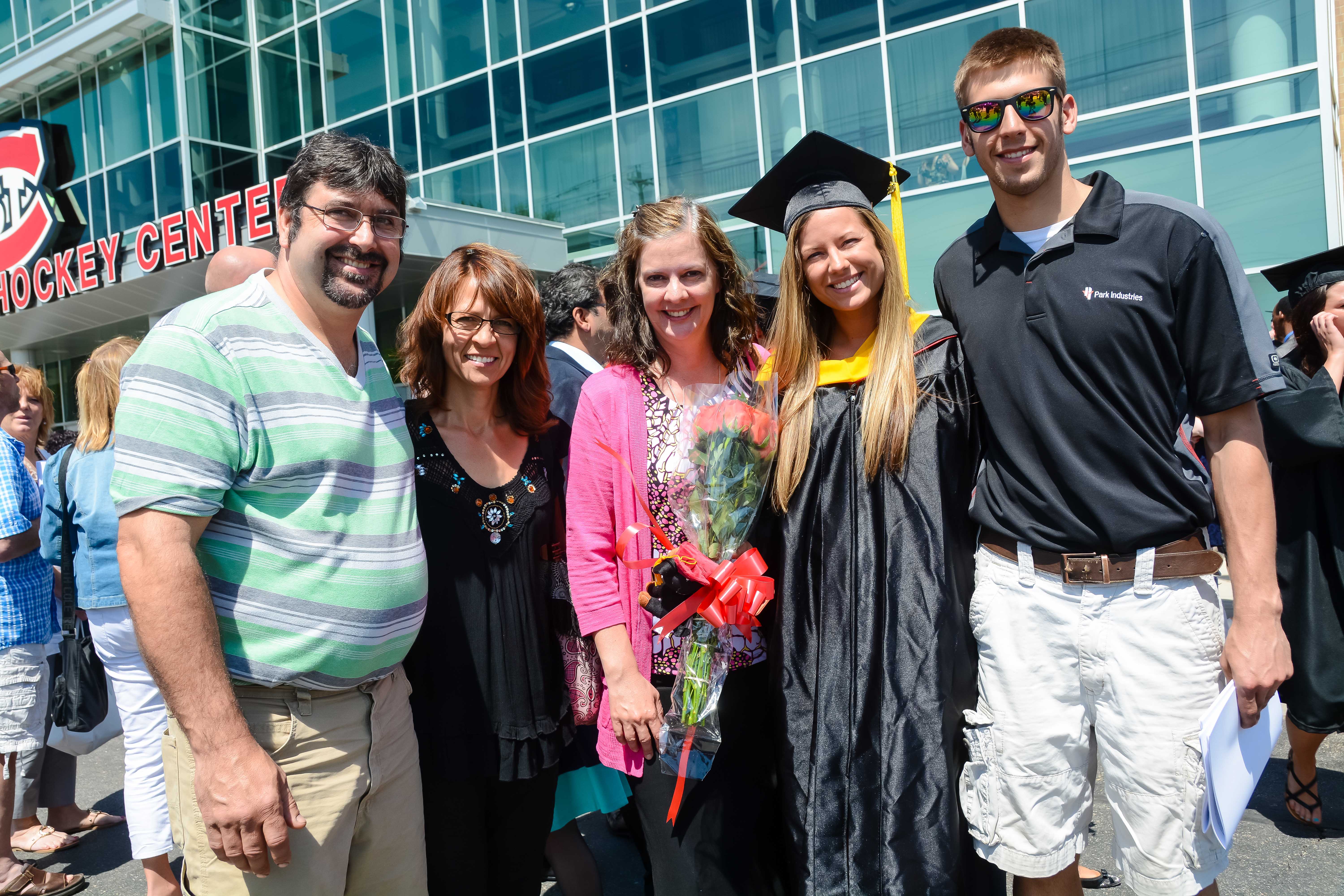 Family and friends gather outside of the Herb Brooks National Hockey Center to congratulate and take photos with their graduate.