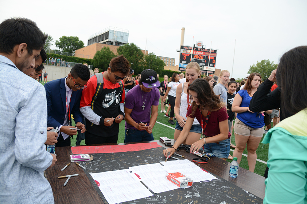 More than 1,200 new and transfer students gathered at Husky Stadium for orientation games and a group photo. More than 1,100 of them stuck around to be greeted by Interim President Ashish Vaidya, St. Cloud Mayor Dave Kleis ’89 and Student Government Leaders Mikaela Johnson and Randall Olson.
