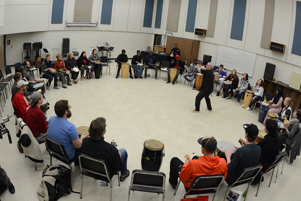 Waayaha Cusub visits Terry Vermillon's World Drumming class.