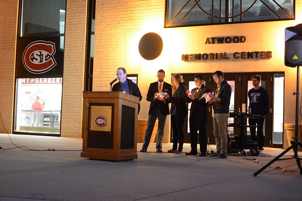 Student Government President Mikaela Johnson, Rev. Chris Cortte, Student Government Vice President Randy Olson, Jesse’s faculty adviser Michael Jeannot and Drake Thompson, Jesse’s former roommate, also spoke.