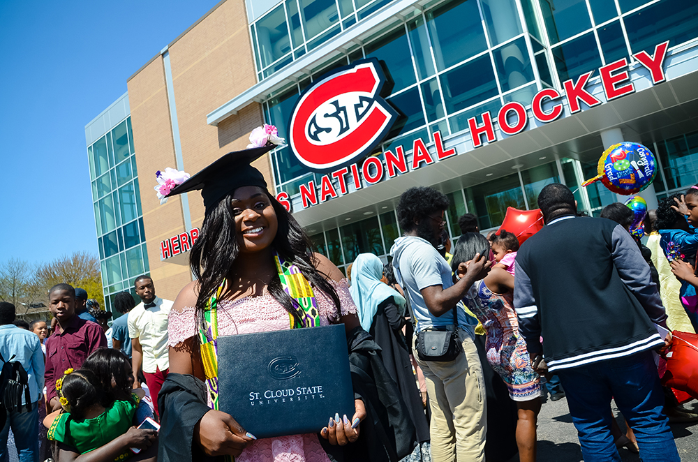 A graduate stands outside of Herb Brooks National Hockey Center