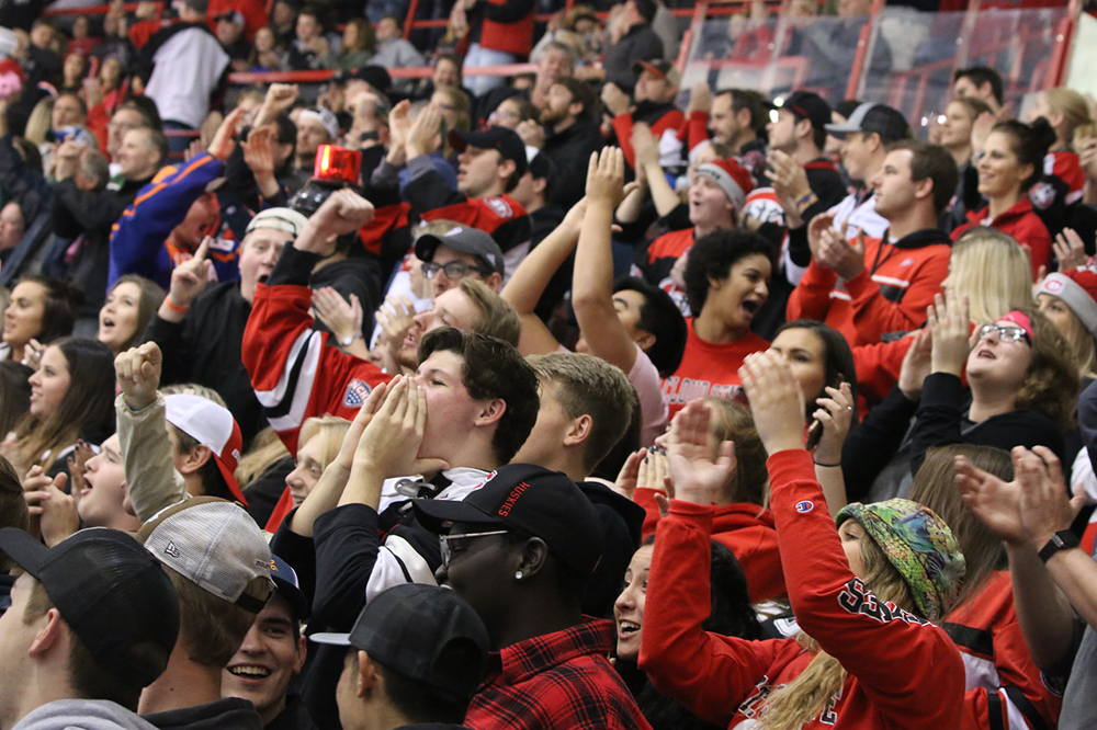 Students cheering on the St. Cloud State hockey team from the stands.