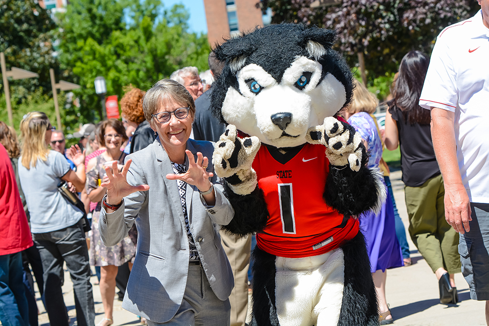 Dr. Wacker meets Blizzard T. Husky at the campus Ice Cream Social July 16