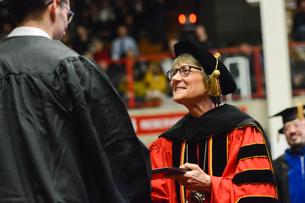 President Wacker greets graduates as they walk across the stage.