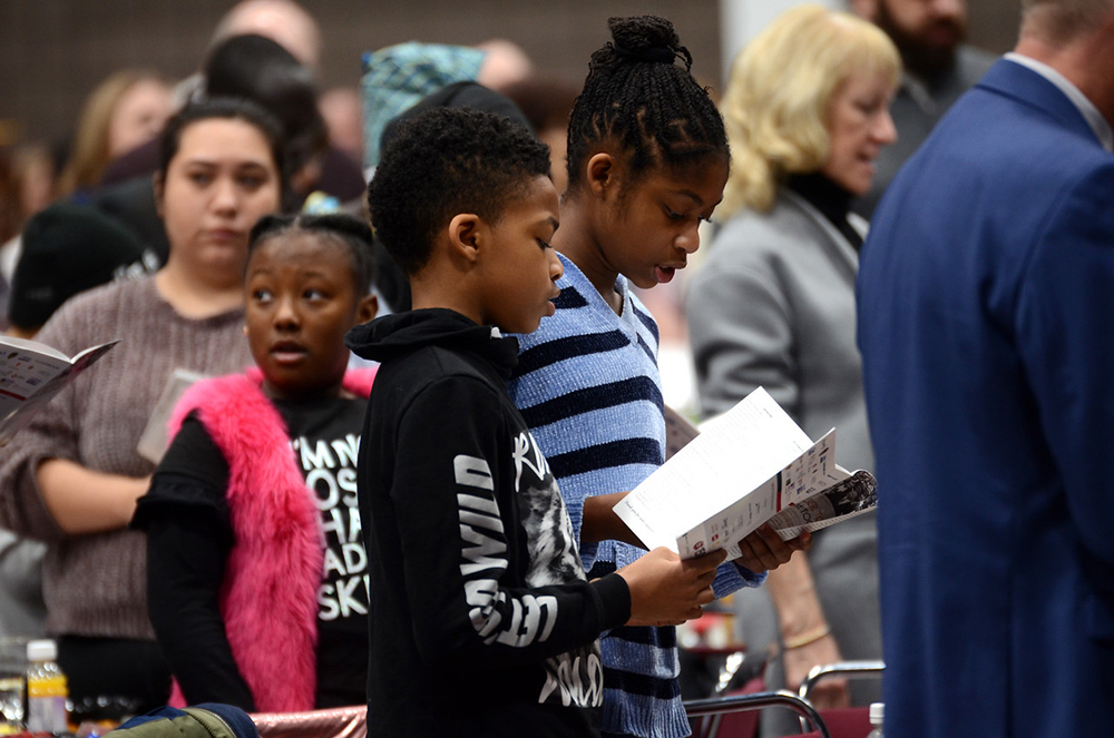 Young students sing along to the program with the St. Cloud State University Concert Choir.