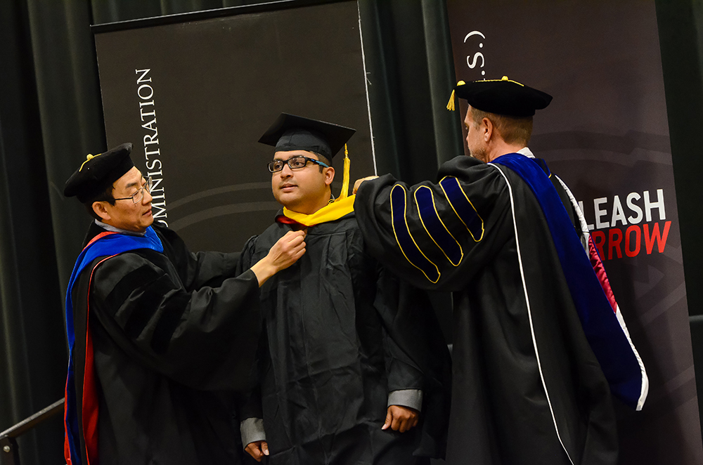 A student earns his hood at the Herberger Business School hooding ceremony.