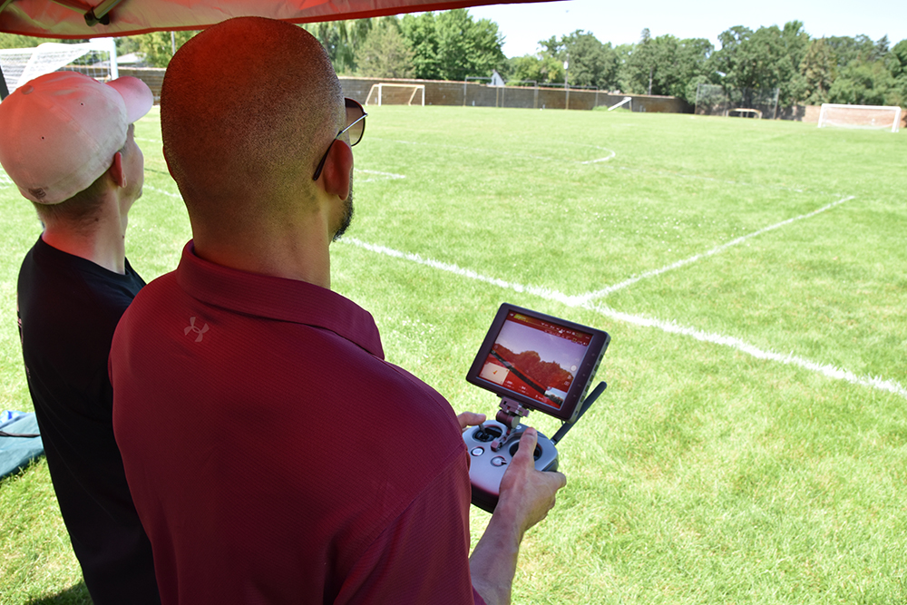 Criminal justice professor Mario L. Hesse flies a drone for the first time over Selke Field. On the controller's screen is a view from the camera on the drone.