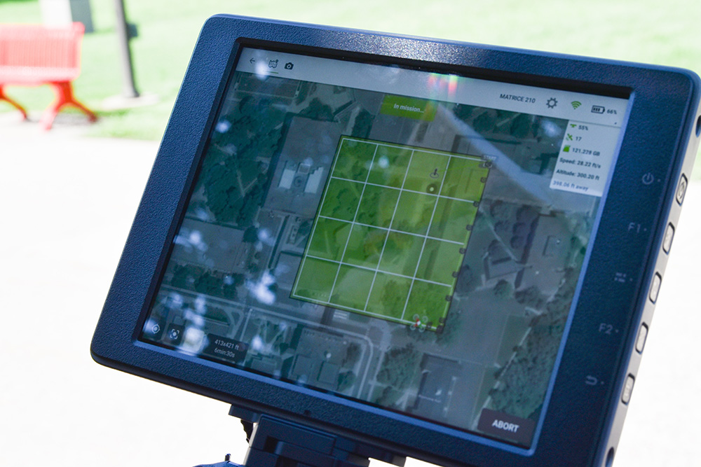 This drone's control panel illustrates a drone recording data above Atwood Mall. The data is being used to create a surface and 3D model of the area for educational purposes.