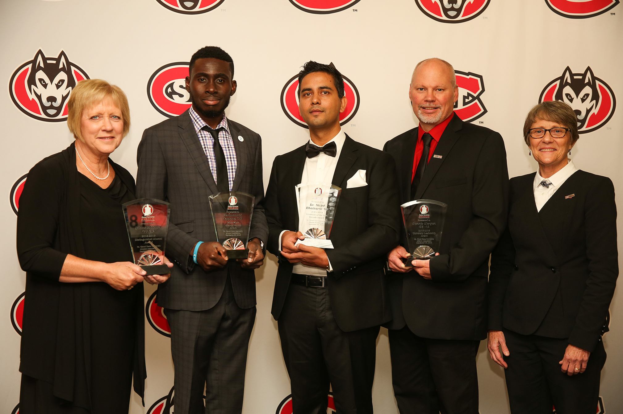 St. Cloud State University's 2018-2019 Alumni Association Award winners (pictured left to right): Diane Moeller '77 '82 (Distinguished Alumni Award recipient), Emmanuel Oppong '13 (Alumni Service Award recipient), Dr. Nirjal Bhattarai '08 (Graduate of the Last Decade Award recipient), Dennis Mergen '93 '12 (University Leadership Award recipient) and SCSU President Robbyn R. Wacker.