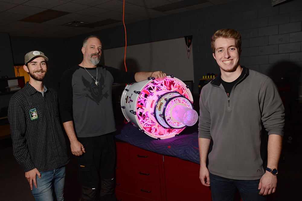 St. Cloud State University students Sam Joyce, left, and Kyle Cielinski, right, used their design and engineering skills to help St. Cloud artist Duff Eisenschenck finish transforming Prince's personal drum kit into a chandelier in his honor. Cielinski designed and printed 3D pieces included in the finished chandelier to complete Eisenschenck's vision. Joyce assisted Cielinski with a lace design etched into one of the acrylic pieces. Photo by Adam Hammer