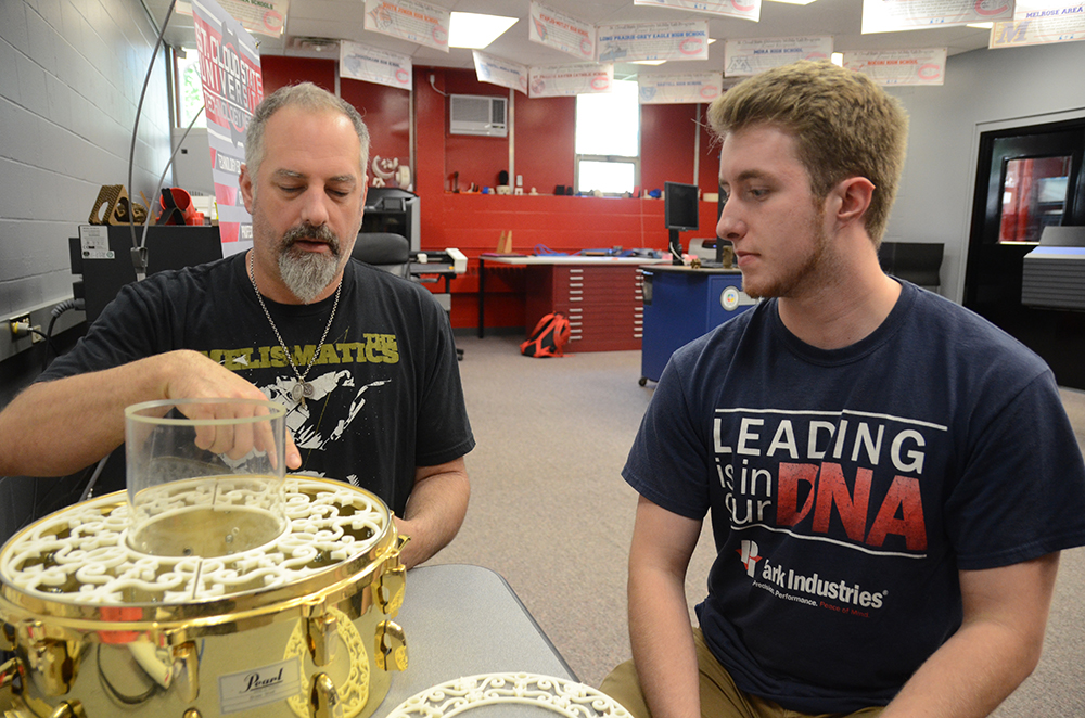 Duff Eisenschenck and Kyle Cielinski looking at the snare drum lamp
