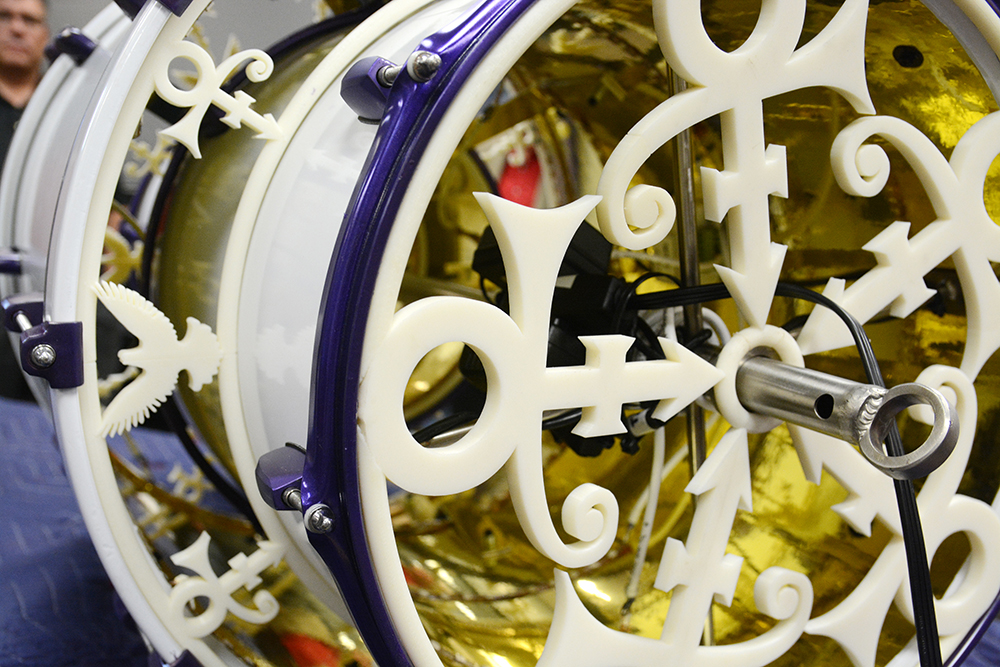 He took the drum kit apart and stacked it into a chandelier. He wanted to incorporate Prince’s symbols into the spaces left by the drumheads.