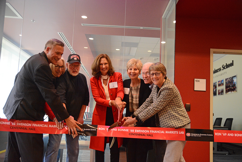 (Pictured from left to right:) Dave Harris, Dean of the Herberger Business School; Teresa Bohnen ’81; faculty emeritus Howie Bohnen ’72; Sherry Smith ’83; Bonnie Swenson ’68; Ron Swenson ’69 and SCSU President Robbyn R. Wacker cut the ribbon marking the dedication of the Ron'69 and Bonnie '68 Swenson Financial Markets Lab.