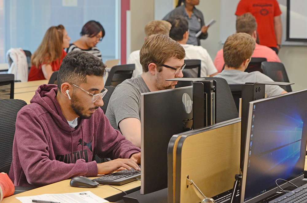 Hasan Makhlooq and Paul Scoles work on computers during a FIRE 491 Managing an Investment Portfolio classin the Ron '69 and Bonnie '68 Financial Markets Lab.