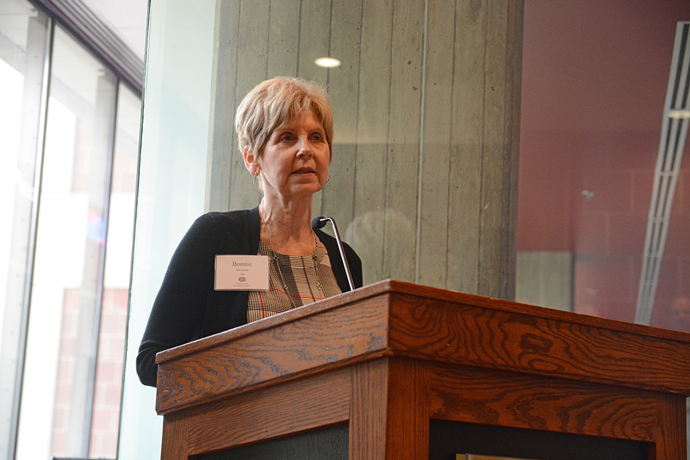Bonnie Swenson speaks about being a first generation college student at St. Cloud State during the ceremony.