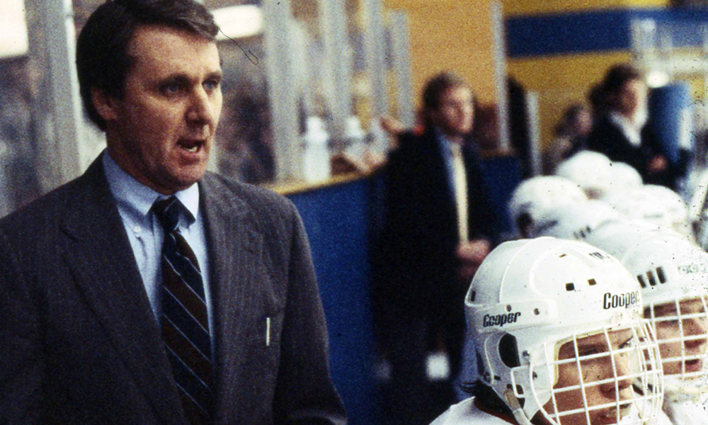 Herb Brooks coaches a hockey game behind the bench 1986-1987. The Herb Brooks National Hockey Center is named for the legendary coach who helped the team enter Division I in 1987-88. Photo courtesy of St. Cloud State University Archives
