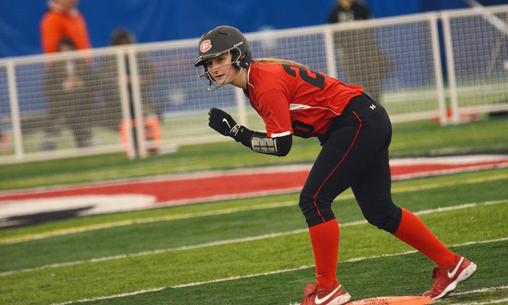 A softball player on the field in the Husky Dome