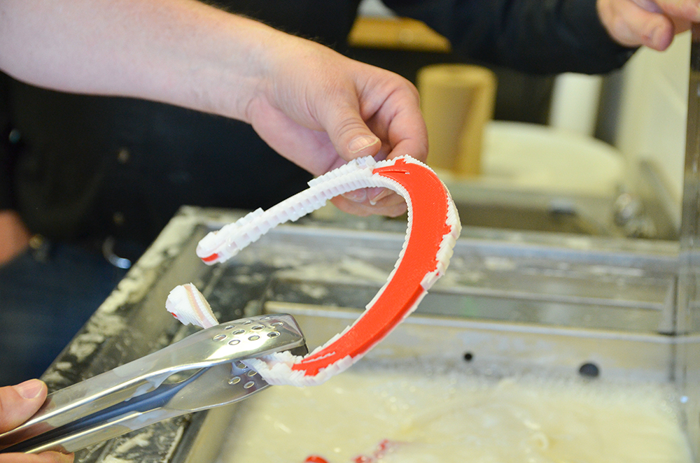 After the shield holders are printed they are bathed in a solution to remove extra plastic material that is produced during the printing process to help create the shape and separate the pieces.