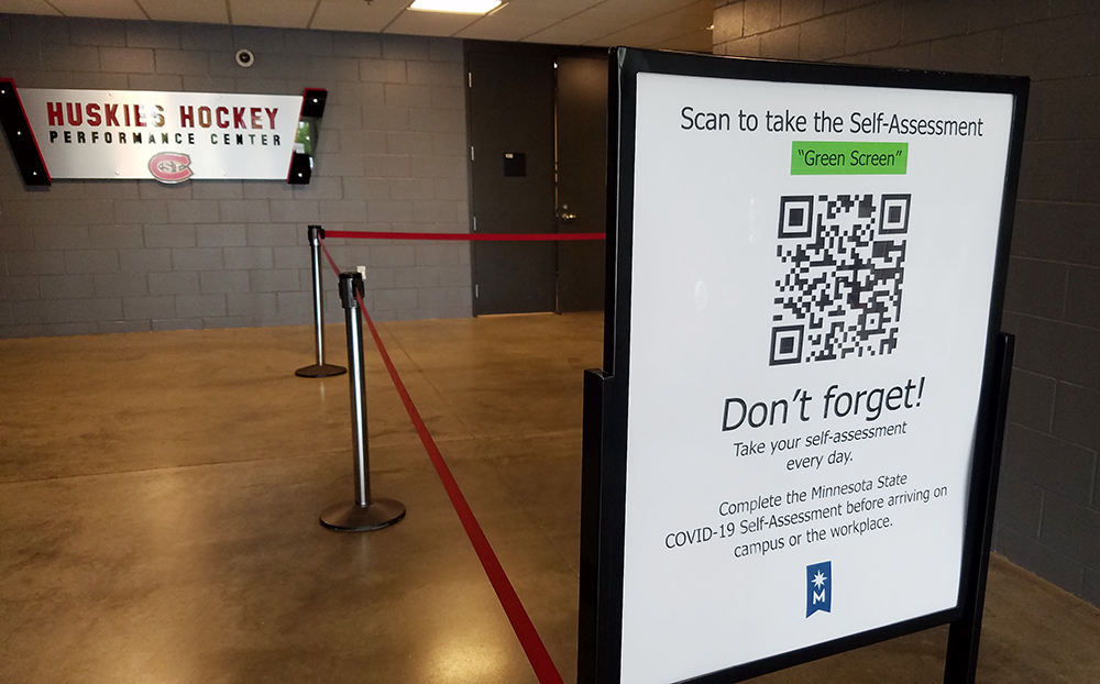 Residential Life also created reminders and affixed them to inside of each residential student’s room door. The Herb Brooks National Hockey Center is using the signs and sign holders throughout the facility to make sure there is a quick option for those that haven’t done their green screens. The signs are posted at entrances, to remind students, employees and visitors to complete their daily screening.