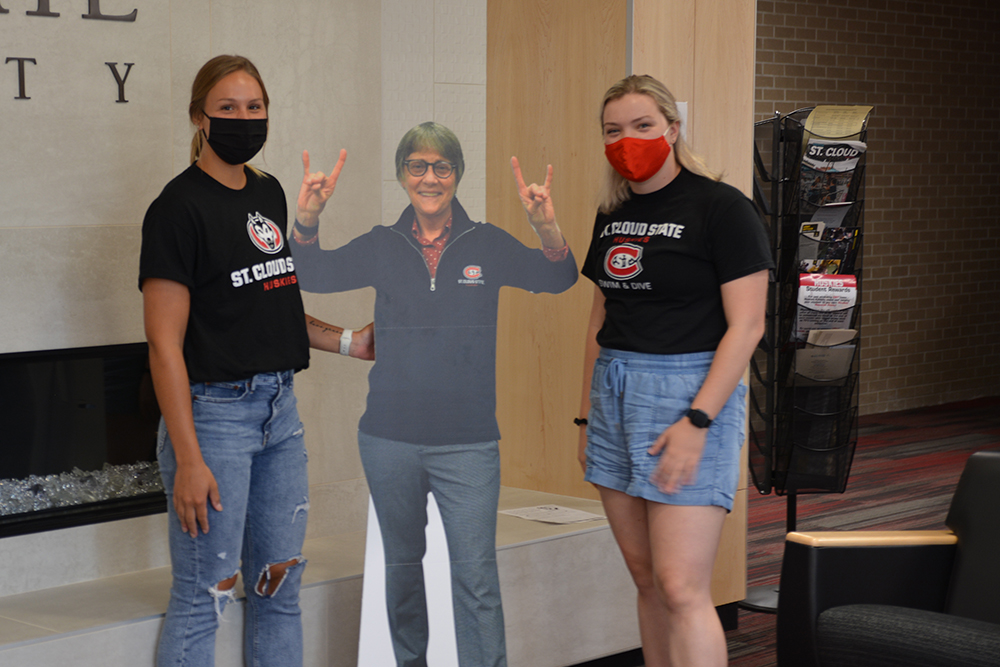Students with a cutout of President Robbyn Wacker