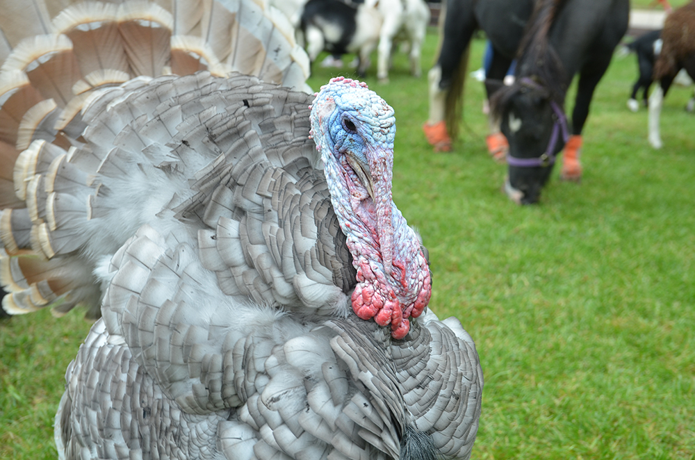 A Happy Tails turkey roams the petting zoo waiting to connect with students.