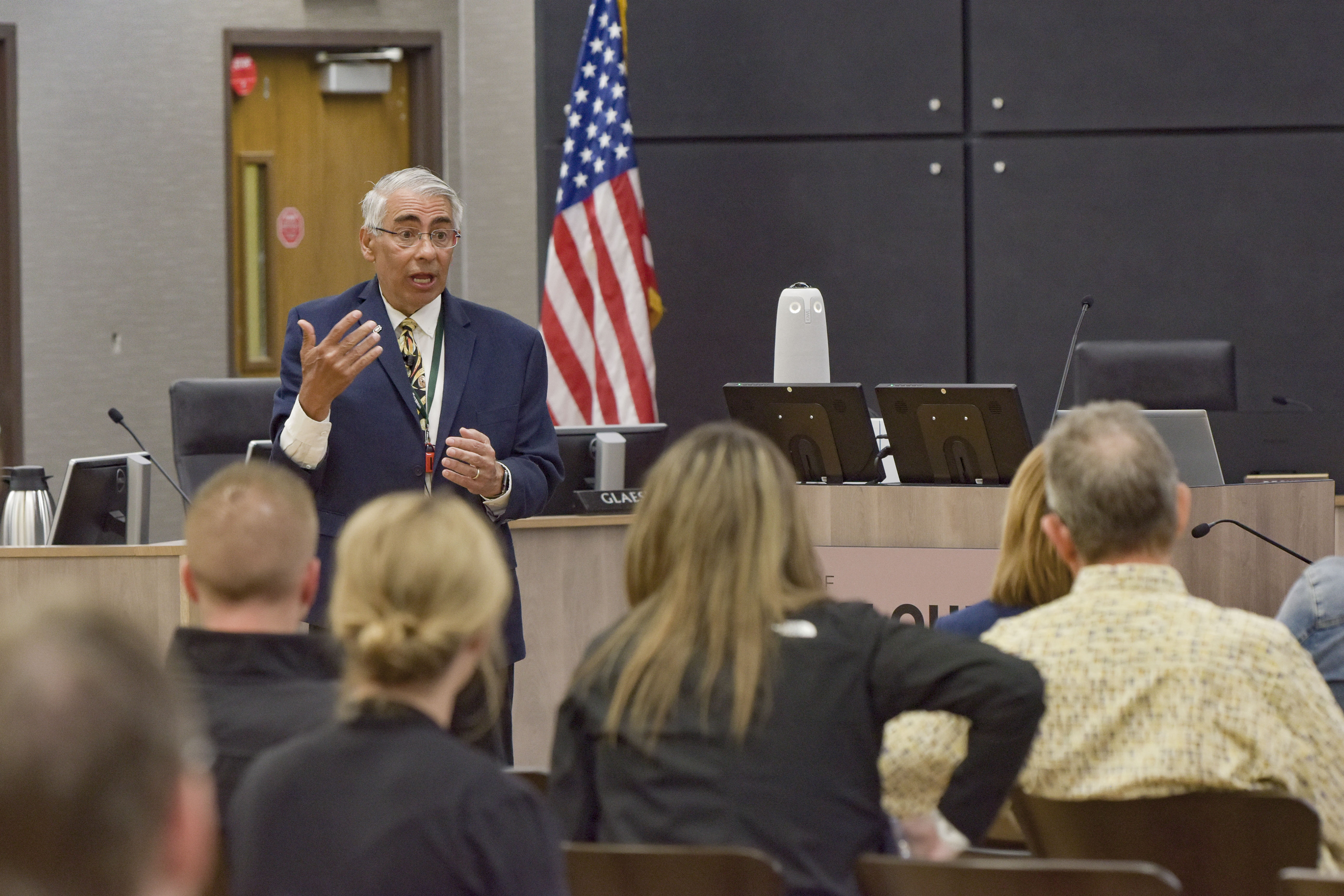 Professor of Economics and Dean of the School of Public Affairs King Banaian addresses the audience at St. Cloud City Hall.