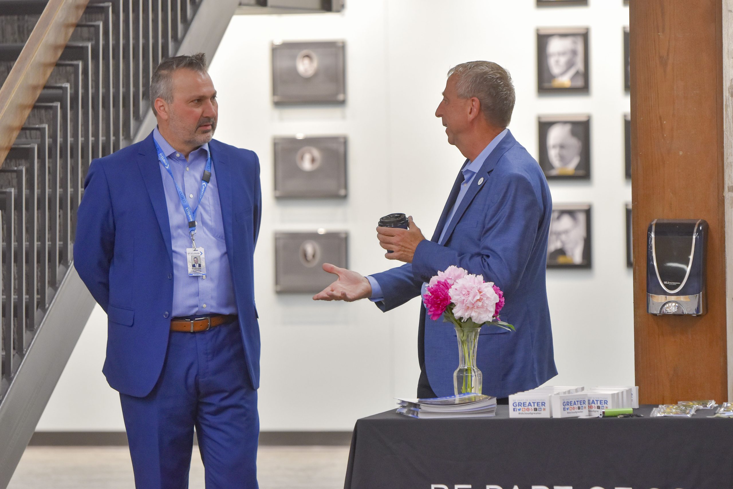 St. Cloud City Administrator Matt Staehling (left) and Mayor Dave Kleis talk prior to the presentation.